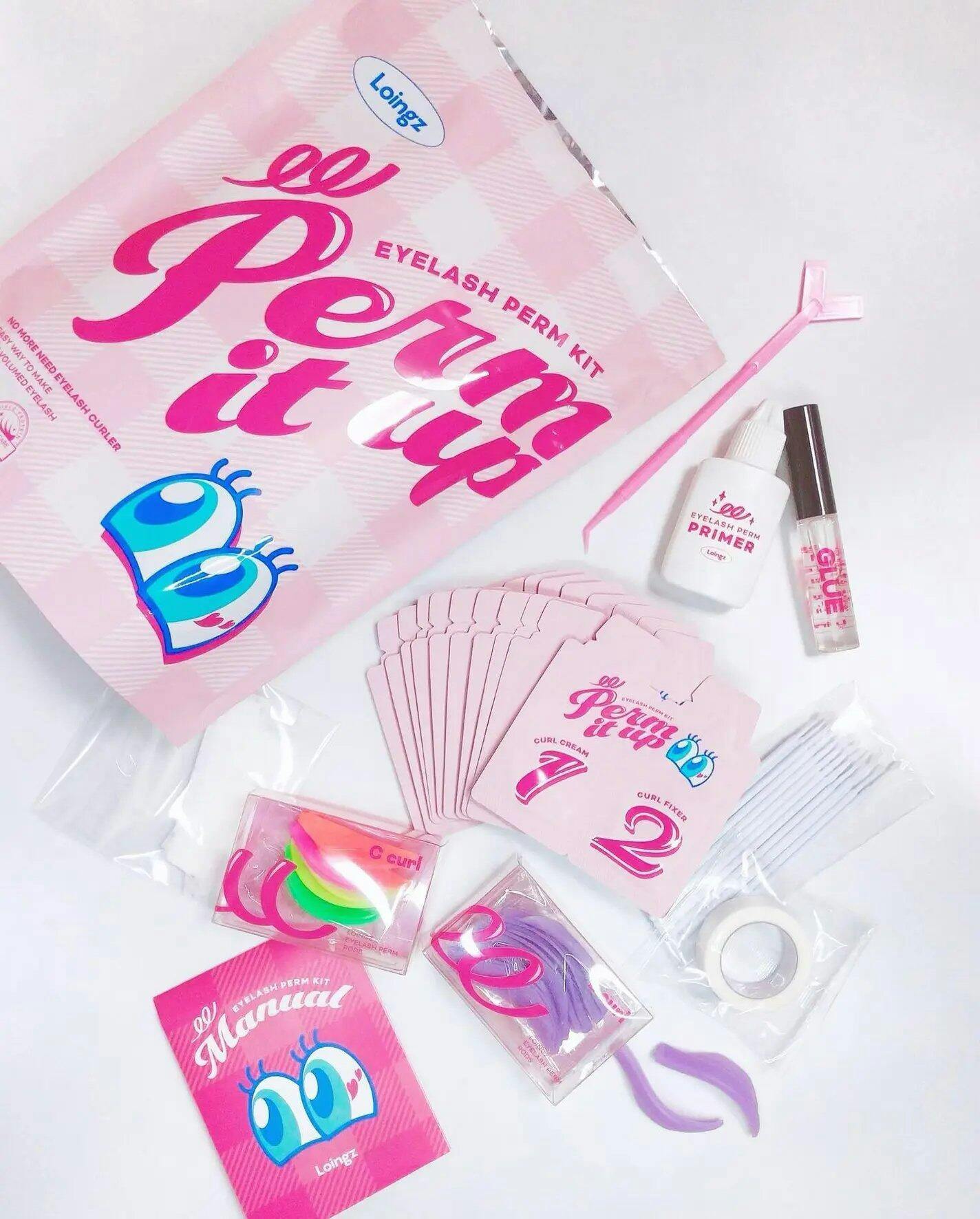 Loingz Perm it up EYELASH PERM KIT I've been doing my own eyelash perms for about a year now and this is my fourth brand, but this kit is by far the best. L curl rods for popping lashes. Generous set of 12 accessories. Highly concentrated protein (collagen, silk +, keratin). Tested to be non-irritating I have thick eyelids like the typical Japanese person, so the C curls that other manufacturers include give me an incredibly natural look. I prefer to curl my lashes really fast without using an eyelash curler, so I was impressed with the L curl. It's the first in Korea to have 4 pairs of C curls + 5 pairs of L curls! The two things I personally look for most when looking for a self-lash perm kit are that it comes with the correct fixing tape, perm paper, and stick, and that it's a single-use kit that's hygienic and safe to use. This is the only one I've come across that includes an L curl rod so far. It's available at the official distributor, Beauty Topi, so check it out!