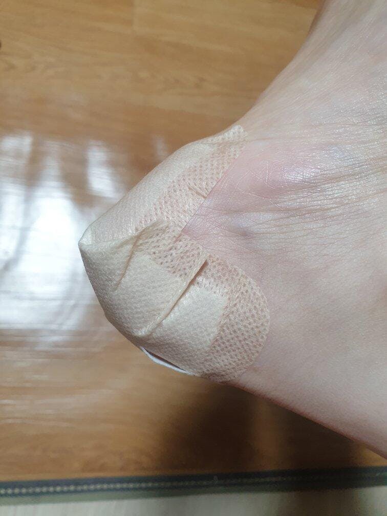 3. Attach the long side of the heel patch horizontally starting from the sole of the foot, then wrap the heel well with the wing parts on both sides.